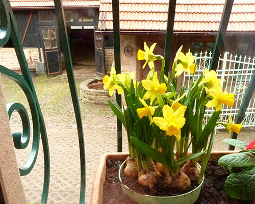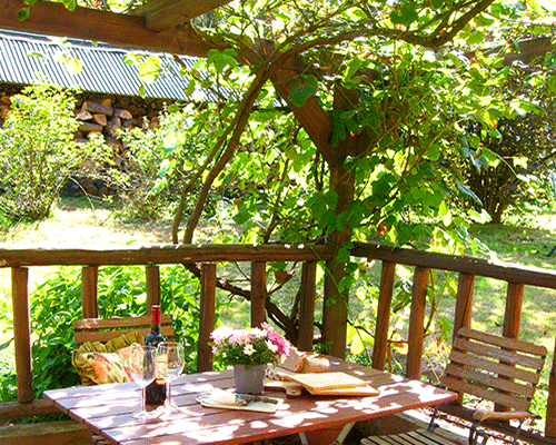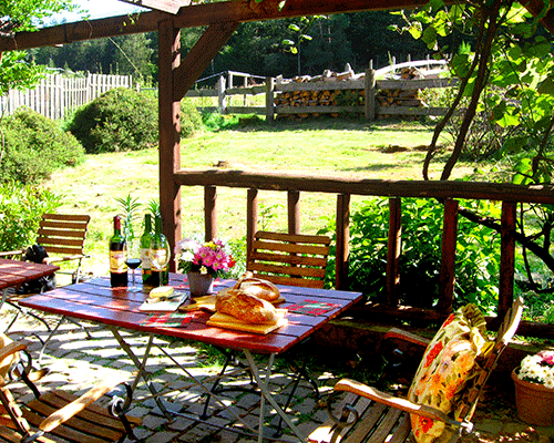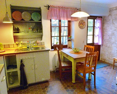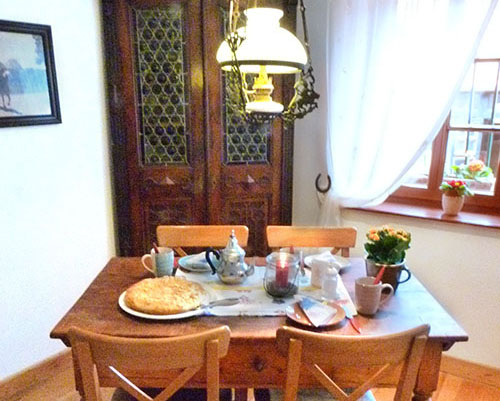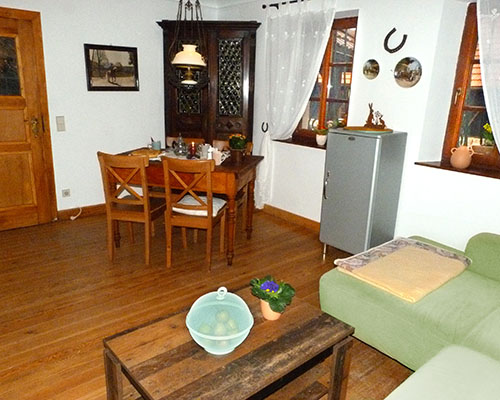 Genießen Sie im Sommer Ihr Frühstück im Freien, in der Sonnenlaube, mit Blick auf die Pferdekoppeln und den Wald. Der Zugang erfolgt direkt durch die gemütliche Küche im Elsässer Stil. Unsere Ferienwohnung ist wohnlich eingerichtet und hält alles bereit, um einen unabhängigen und besonderen Urlaub zu verbringen. Mitten im Wald können Sie Ruhe genießen, gut schlafen und erholt aufwachen.